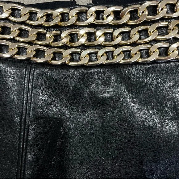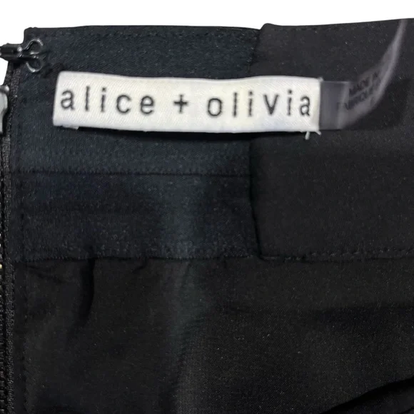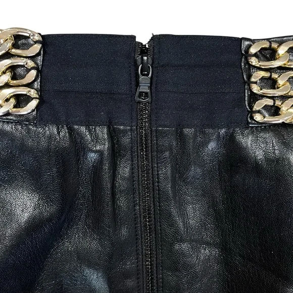 WOW! This vegan leather A-line mini skirt from Alice + Olivia featuring an eye catching gold chain waist detail is a definite show stopper while remaining timeless at the same time. That's hard to come by. It's a fashion essential must have, with a little pizazz that you'll reach for time and time again. And the vegan leather is super buttery soft. Stunning!Features:Attached gold chain waist detailingA-line shape with contour waistlineFully linedExposed back zip openingPolyurethane face/polyester, elastane liningDry cleanImportedCondition: Very goodMeasurements are laid flat and are approximate:Length: 15"Waist: 16"PLEASE NOTE: We do our best to ensure that our photos are as true to color as possible, however due to different computer monitor settings, lighting sources, and digital photography variances, actual colors may vary from images shown. Thanks for your understanding!All of the monies collected from online sales go back into the running of our outreach centers in Miami and Broward Counties.Please take a look at our website:http://caringplace.orgTo see what we are working to achieve or if you could help in any further way.We thank you for taking the time to look at our items for sale.Our Mission: Transform The Lives of Homeless Men, Women and Children.Our Vision: No One Is Homeless.