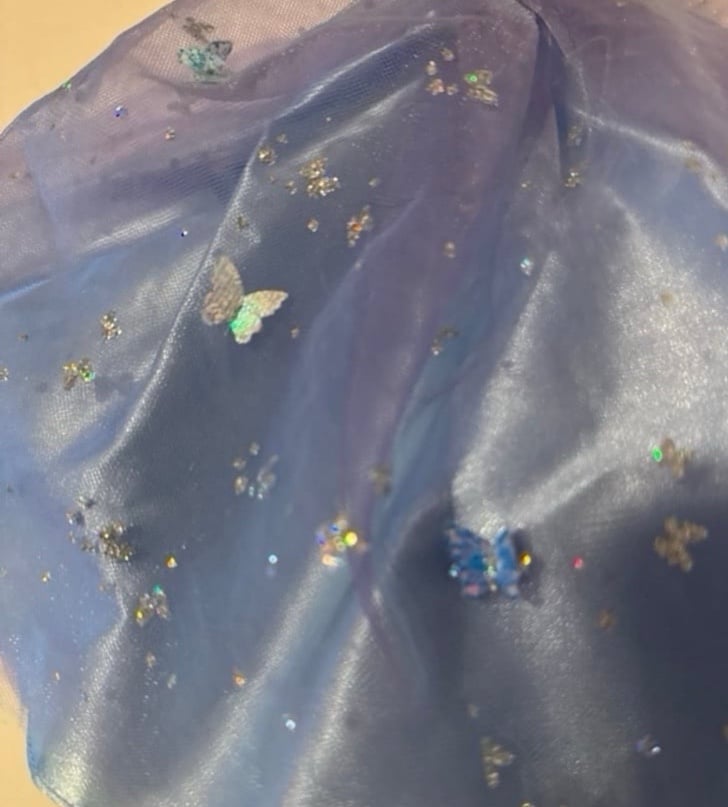Ella enchants in an iconic dress with multicolor blue and purple layers that create spectacular volume. She sparkles from head to toe with delicate, magical butterflies and foil print accents