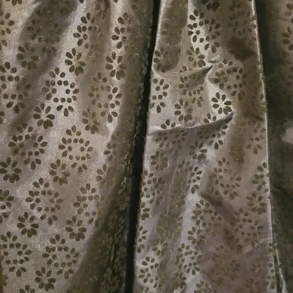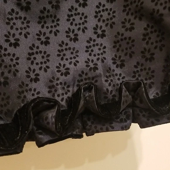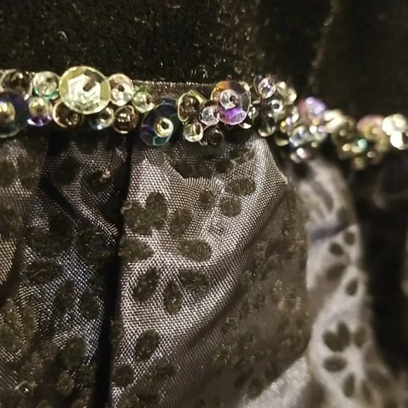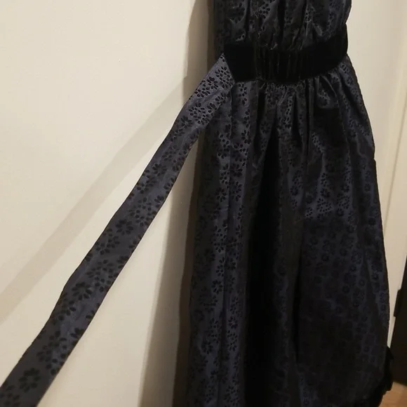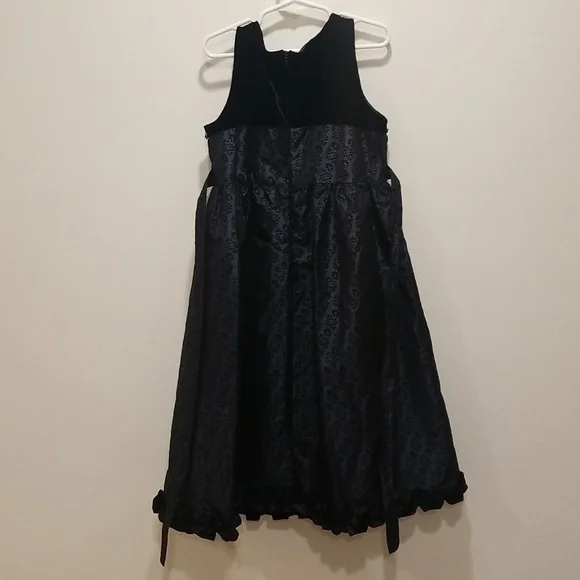 Toddler's size 8 formal dress in all black. Zipper in the back, lining underneath. Velvet straps lined by a row of sequins above the waistline (swipe to see close up). The dress has a pattern of velvet flower petals and dots stamped on a shimmery midnight blue fabric (swipe to see close up). The dress is darker in person than in the pictures. Velvet lining on the waist where a bow can be tied with the two straps attached. The hemline is ruched velvet. In great condition - only worn once.Dress and lining 100% polyester 100% nylon25 in acrossDry clean only