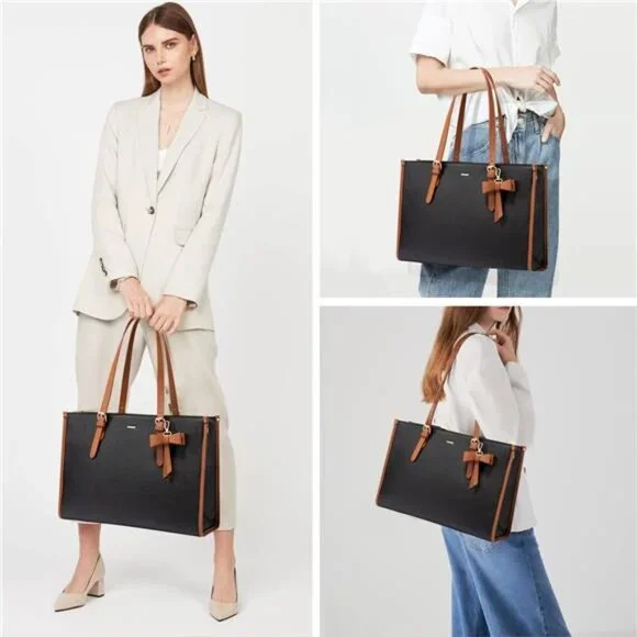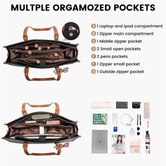 The laptop Bag features a 15.6-inch computer pocket, an iPad pocket, a middle zipper pocket, an internal side zipper pocket, two large opening compartments, two small opening pockets, two pen pockets and an outside zipper pocket. Large enough to keep all your things well organized.The laptop bag for women is made of high-quality PU leather and polyester lining, making it durable and fashionable. Reinforced metal feet will reduce friction and scrape of bottom of the work bag while daily use, last longer than other work bag.The laptop tote bag for women comes with adjustable shoulder strap and additional shoulder strap. Adjust the shoulder strap to right length or additional shoulder strap can function as a shoulder or crossbody strap.With a multi-purpose use and a classy look which never goes out of style, this laptop bag is perfect for work, office, shopping, business, travel and outdoors. The bag can be used as a handbag purse, shoulder bag, tote bag, laptop bag briefcase, computer bag. Perfect gift choice for teachers, attorneys, and all office ladies.
