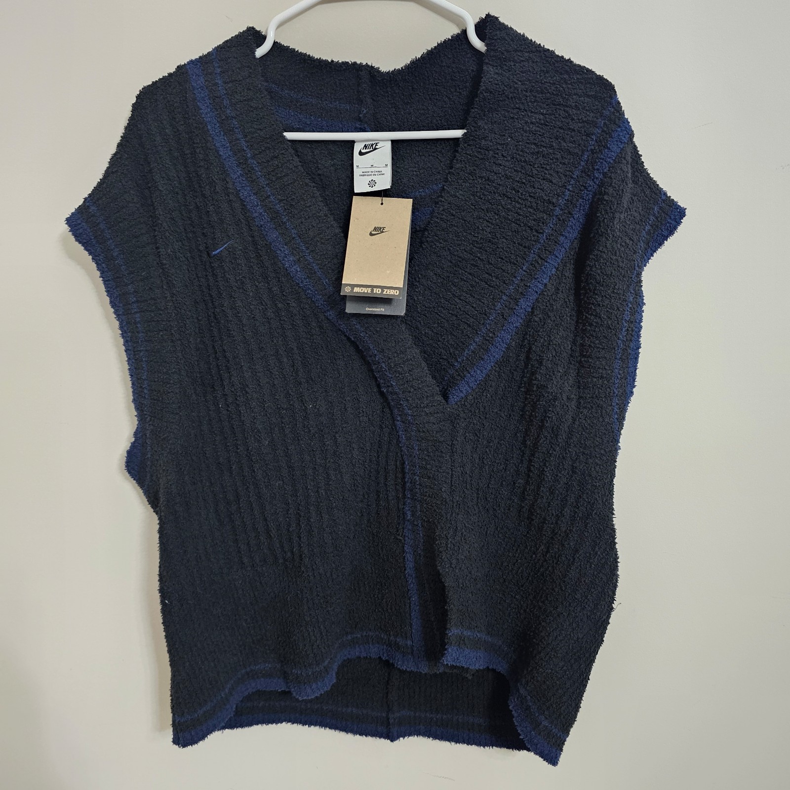 This Women's Nike Sportswear Collection Knit Vest in size M is a versatile and stylish addition to any wardrobe. Made from a polyester blend in a classic black color, this sleeveless vest features a relaxed fit and a waffle-knit design, perfect for layering during the winter season. The V-neckline and asymmetrical sleeve add unique accents to the garment, while the Nike logo adds a touch of sporty flair. Ideal for travel, parties, or casual outings, this vest is machine washable and offers both thermal and oversized features for added comfort and style.