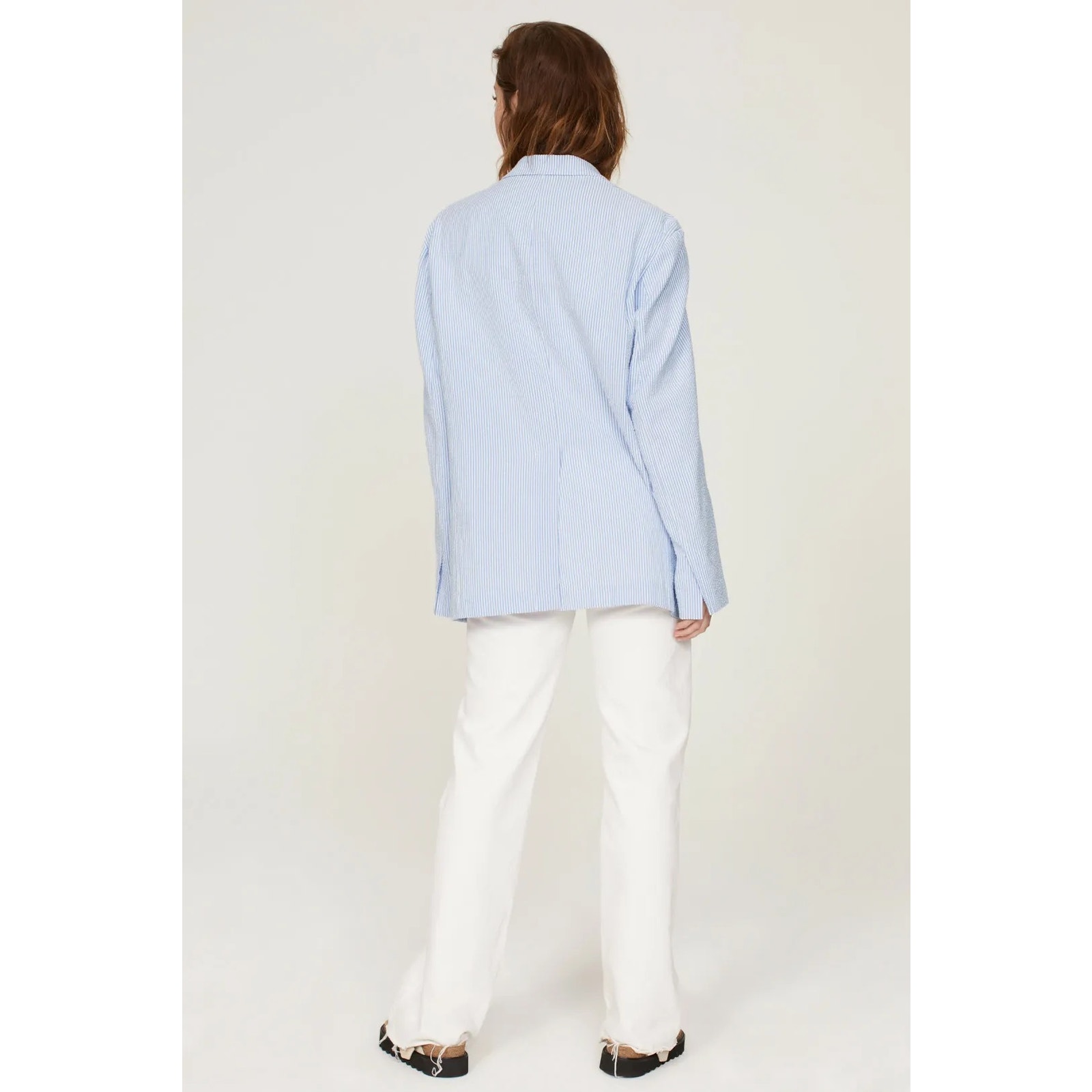 Blue striped polyester blend (75% Polyester, 25% Cotton). Blazer. Long sleeves. Collar. Front button closure. Imported. Oversized fit.